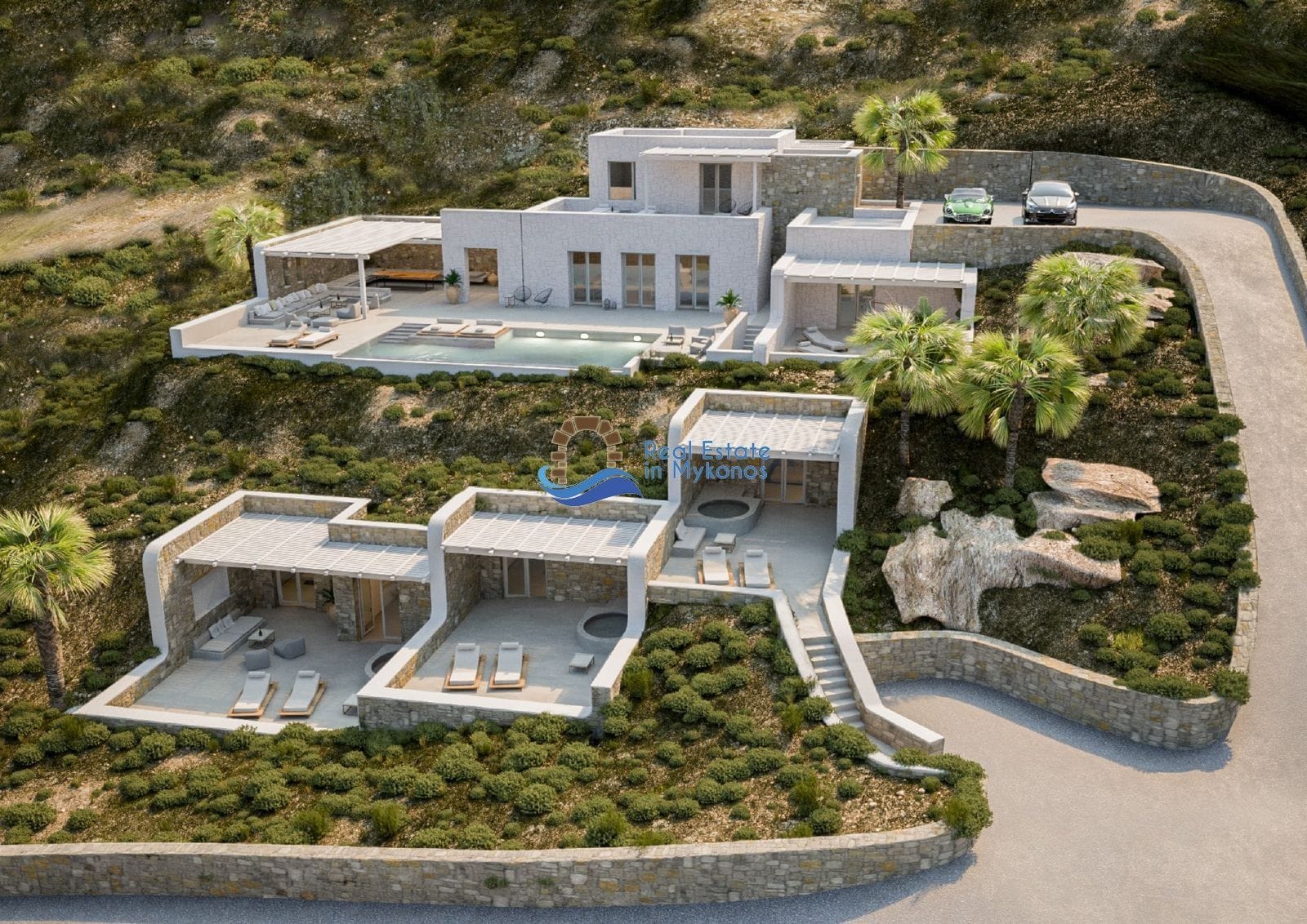 Dự án nằm trên tổng quỹ đất hơn 22.000 m², được chia thành 5 lô độc lập, mỗi biệt thự sở hữu diện tích đất khoảng 4.000 m², với lối kiến trúc hiện đại kết hợp tinh tế với địa hình đá đặc trưng của đảo. Mỗi căn được thiết kế riêng biệt, có hồ bơi riêng, sân hiên rộng, các khu vực chức năng mở và bán ngoài trời – phù hợp với khí hậu và văn hóa nghỉ dưỡng Địa Trung Hải. Tầm nhìn hướng biển và hoàng hôn hoàn toàn không bị chắn, mang lại giá trị sử dụng và thương mại cao.